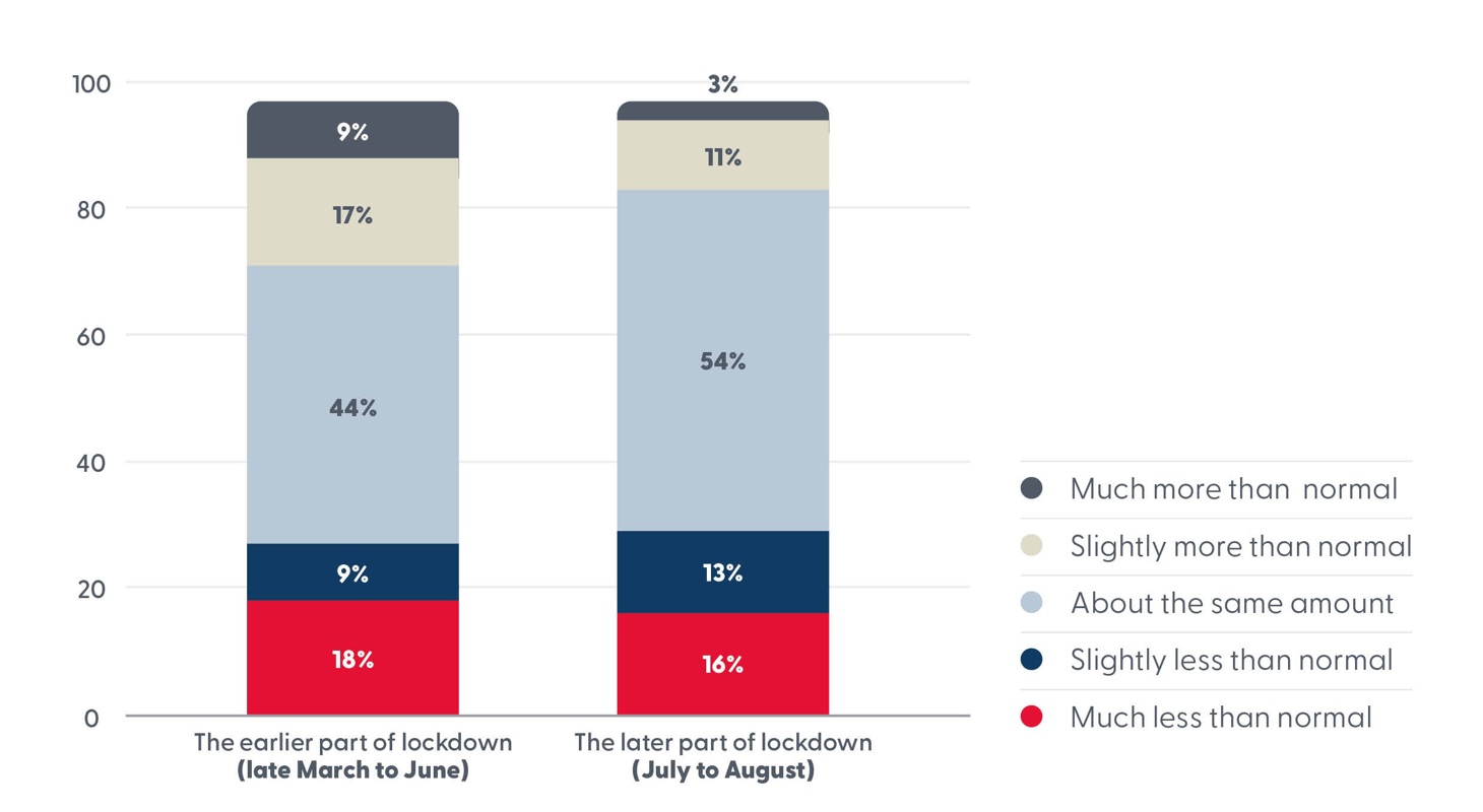 In the early stages of the pandemic (late March to June), when lockdown restrictions were at their height, 26% of all drinkers report drinking more than normal. This falls to 15% as restrictions eased. 11% of drinkers report drinking at higher than normal levels throughout the pandemic. This implies that some drinkers were able to moderate their drinking habits as the pandemic progressed, but others are continuing to drink at increased levels and could be forming habits that will be harmful in the long term.