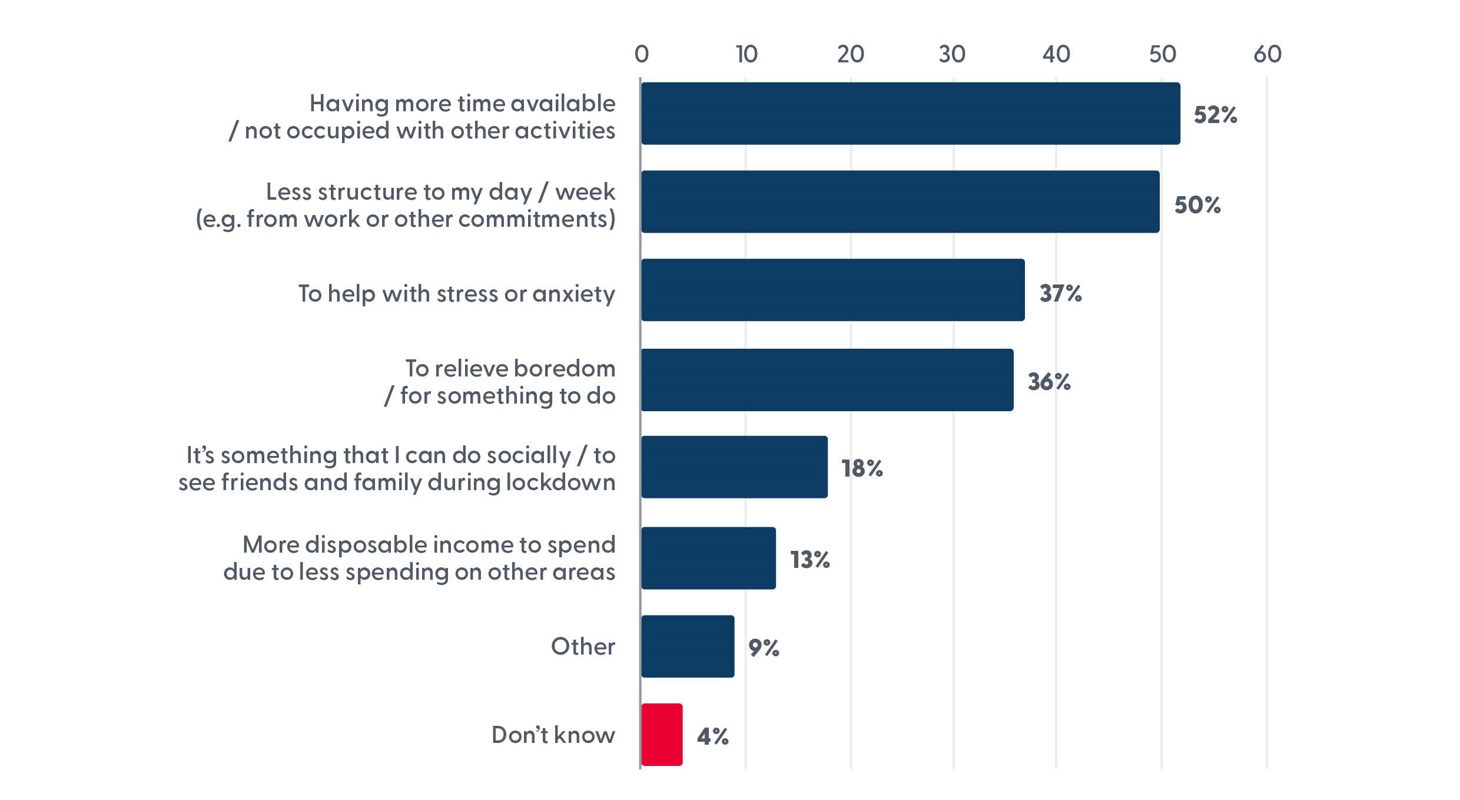 Reasons for drinking more during the pandemic included having more time available, and less structure to the days/weeks.